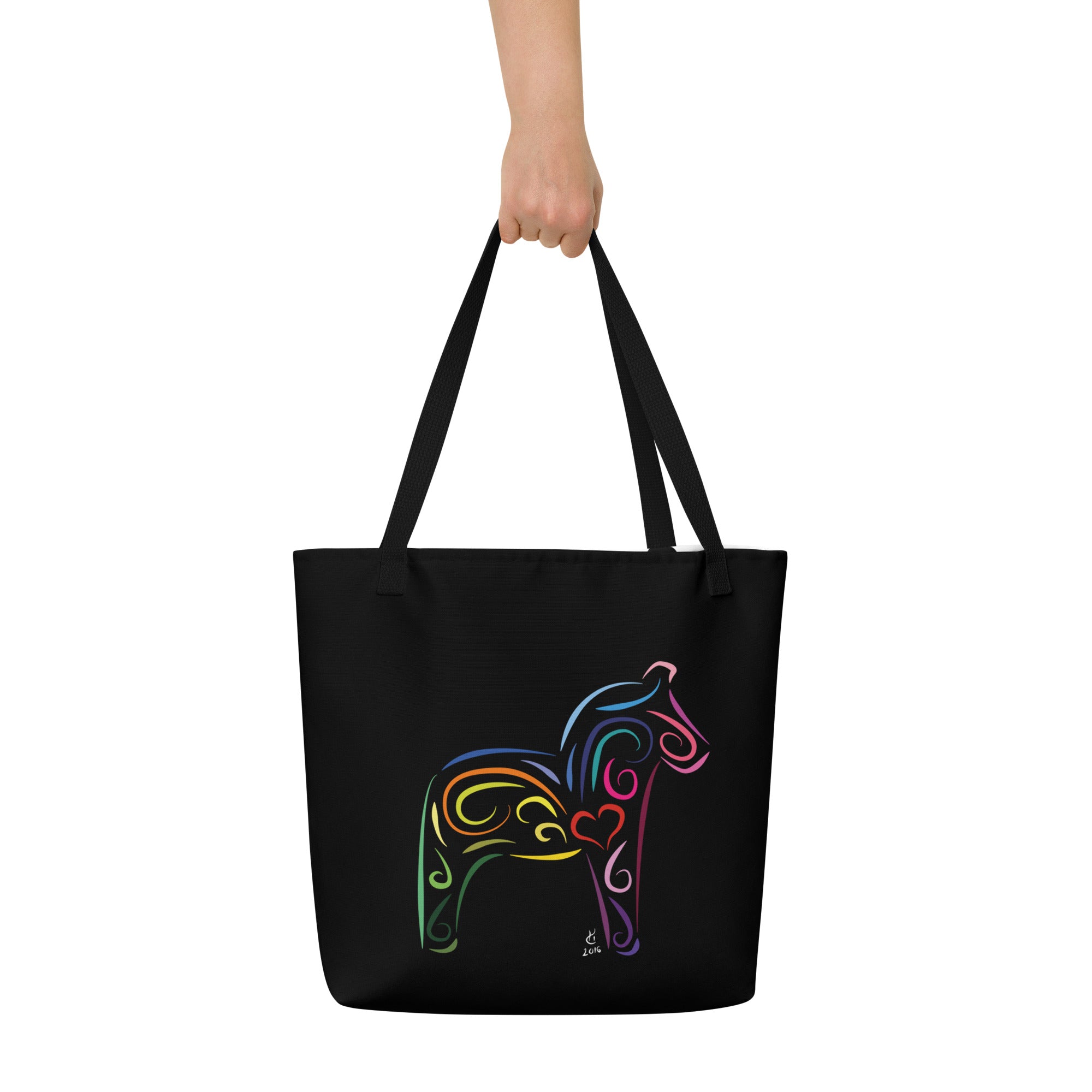 Vår Dalahästar Shoppingbag (Strandväska) är den perfekta kombon av funktion och stil. Med sitt färgstarka dalahästmotiv och rymliga design passar den lika bra till matbutiken som till stranden, jobbet eller marknaden.